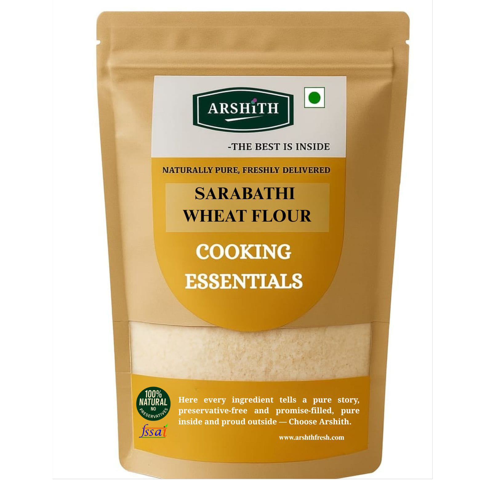 Arshith Fresh Sarabathi Wheat Flour is made from select Sarabathi wheat grains, known for their natural sweetness, golden color, and soft texture. Carefully sourced from trusted farms, the wheat undergoes a gentle soft grinding process that preserves its nutrition, aroma, and original taste — without adding any maida, preservatives, or artificial agents.